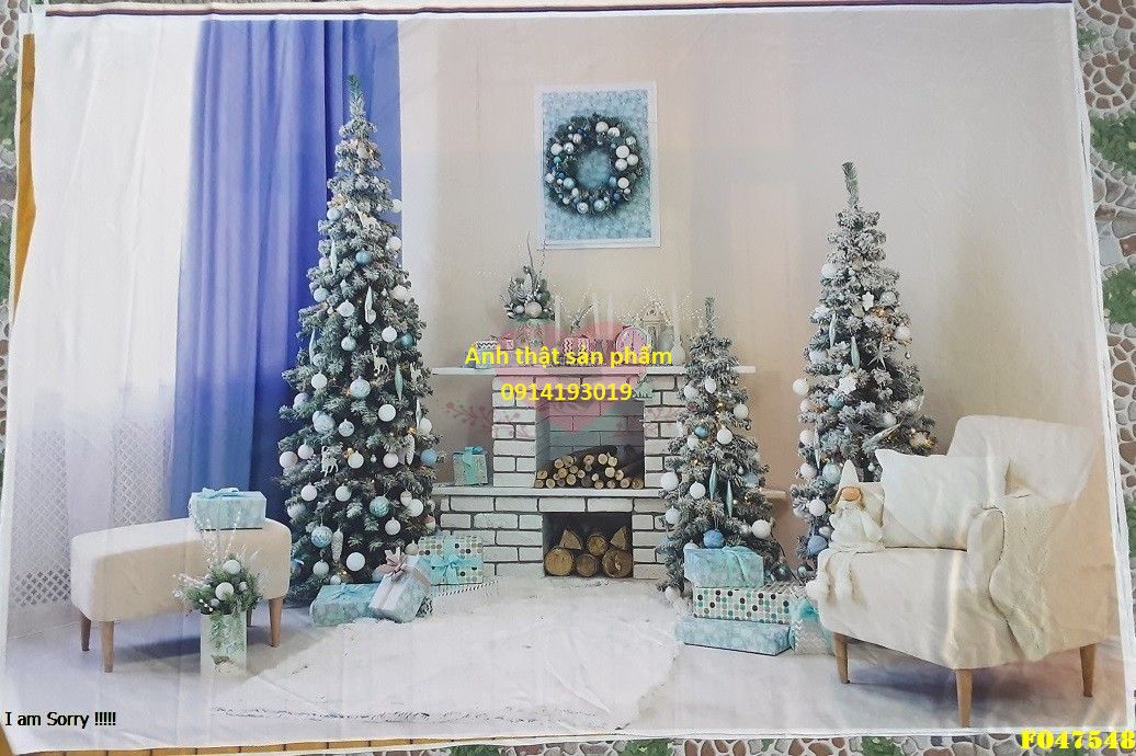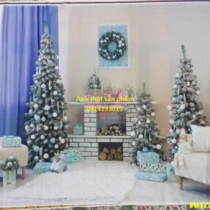 Fo4754- Phông vải 3D Chụp Ảnh Giáng Sinh,Lò Sưởi Cây Thông Xanh Bạc Sang Trọng,